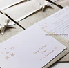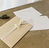 Convite com envelope de cor imitação linho, personalizado, em papel branco texturado de 180gr e fita de cetim champanhe.